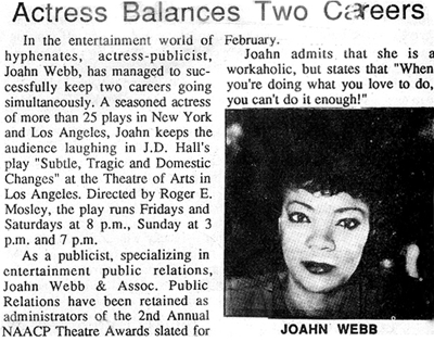 Joahn distinguished herself as a publicist with her long association as a Board member of the Beverly Hills/Hollywood NAACP. As Director of Press and Publicity, she managed the press for several NAACP Image Awards Programs and wrote articles for their souvenir journals. Joahn also wrote an extensive article on an Annual Image Award Program for the national NAACP Crisis Magazine. Joahn is an original member of the NAACP Theater Awards Committee and one of the founders of the Theatre Awards. Her article on the journey of the Theater Awards from its original inception as part of the NAACP Image Awards to it becoming the prestigious Beverly Hills/Hollywood NAACP Theatre Awards Program. published in a Theater Awards souvenir journal. Her partnership with W/W & Associates was a full-service public relations company, specializing in event coordination and entertainment public relations.